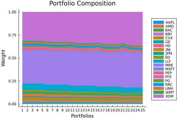 length = 5))), pr);Now we only need to maximise the return given both risk measures. Internally, the optimisation will generate the mesh as a product of the ranges in the order in which the risk measures were provided. This also works with the MeanRisk estimator, in fact, NearOptimalCentering uses it internally.