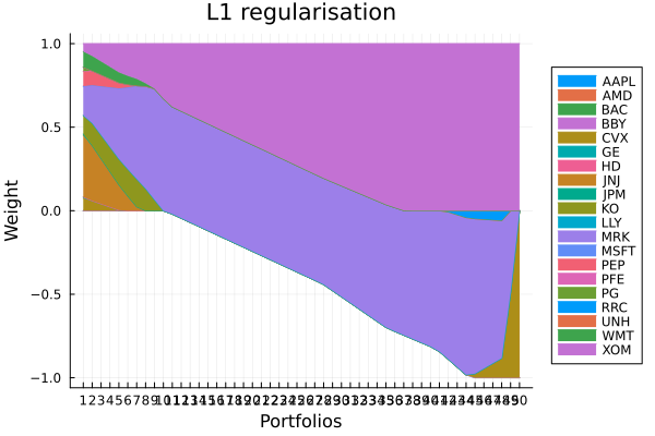 L1 regularisation (also known as Lasso regularisation) adds a penalty proportional to the sum of the absolute values of the portfolio weights. This encourages sparsity in the portfolio, leading to fewer assets being selected.